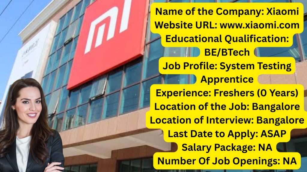 There are job openings for freshers in Xiaomi company. Xiaomi hiring freshers for the position of System Testing Apprentice in Bangalore. Freshers from BE/BTech can apply for this recruitment 2025. If you are interested & eligible for this job role then apply as soon as possible, because Xiaomi will stop receiving the applications once they get the expected number of applications/ Resumes.