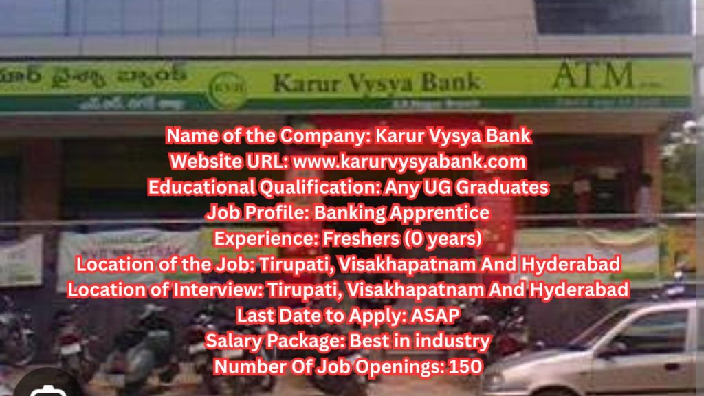 There are job openings for freshers at Karur Vysya Bank. Karur Vysya Bank is hiring freshers for the position of Banking Apprentice in Tirupati, Visakhapatnam And Hyderabad. Freshers from Any UG Graduates can apply for this recruitment in 2025. If you are interested in and eligible for this job role, then apply as soon as possible, because Karur Vysya Bank will stop receiving applications once they get the expected number of applications and resumes.